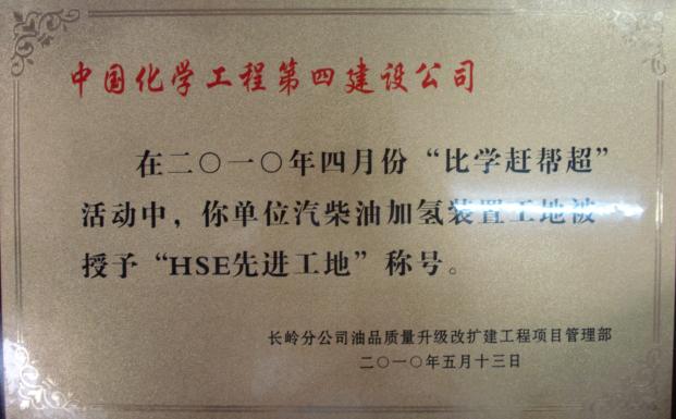 在隨后的“4.30”控制點和“5.20”控制點施工中,項目部精心組織施工、日夜奮戰、齊心協力,順利完成了這兩個控制點,贏得業主和監理的一致贊揚,在長煉樹立起四化建這面旗幟。在2010年4月,業主組織開展的“比學趕幫超”活動中,項目部從20多家參建單位中脫穎而出,榮獲了“文明工區獎”、“比學趕幫超活動先進單位”、“質量樣板”、“HSE先進工地”四個獎項。在2010年5月,項目部又再次榮獲“比學趕幫超”活動先進單位。在施工中,先后有付承、張治冬、丁振華、周葵花、肖小健和劉立新獲得業主授予的“優秀焊工”獎,朱文捷、李衛紅兩人獲業主授予的“HSE”先進個人。