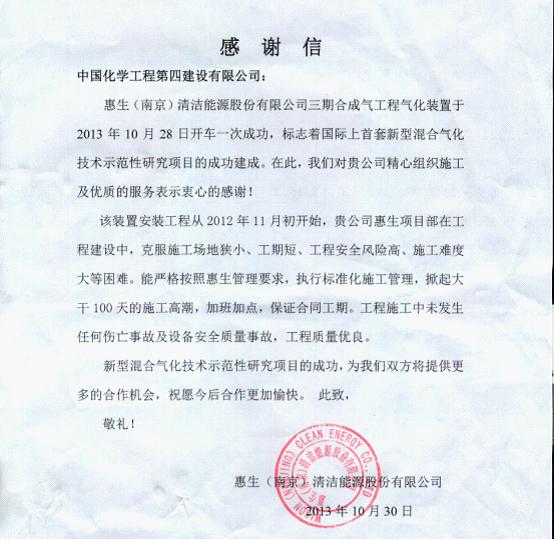 氣化裝置是繼其他各套系統(tǒng)開(kāi)車成功后最后開(kāi)車的核心裝置。它的成功開(kāi)車標(biāo)志著全部施工任務(wù)圓滿完成。分公司在該項(xiàng)目上創(chuàng)造了工程進(jìn)度、質(zhì)量安全、業(yè)主服務(wù)三個(gè)一流,用心血和汗水為業(yè)主奉獻(xiàn)了精品工程,展示了化建湘軍的風(fēng)采,更獲得了業(yè)主來(lái)信高度贊揚(yáng)!
