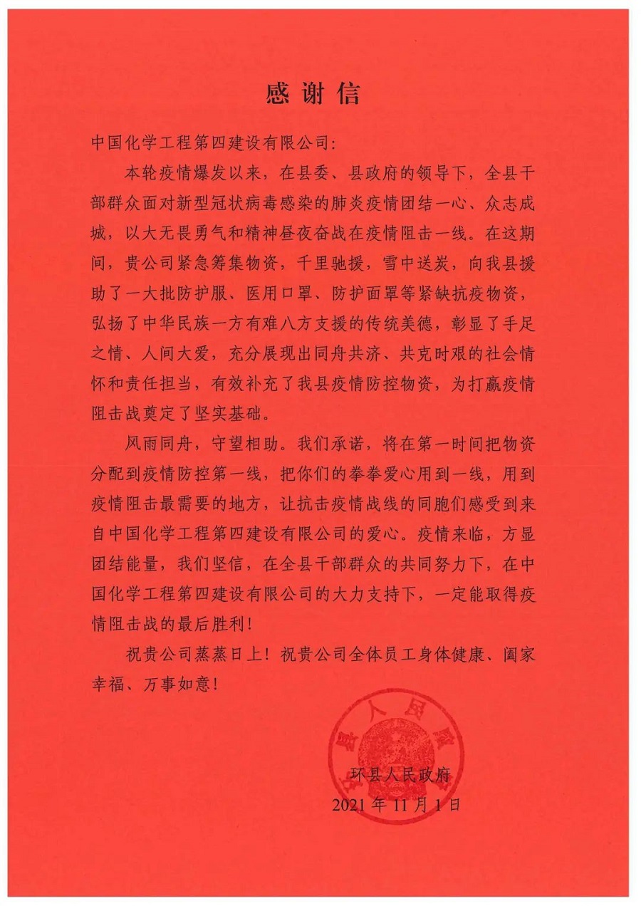 11月1日,公司收到甘肅省環(huán)縣人民政府向公司發(fā)來(lái)的感謝信。信中對(duì)公司向環(huán)縣進(jìn)行抗疫物資捐贈(zèng)的愛心舉動(dòng)表示衷心感謝,并稱在這個(gè)特殊時(shí)期,公司主動(dòng)參與環(huán)縣的疫情防控,用拳拳愛心凝聚正能量,以殷殷真情共筑防控網(wǎng),既體現(xiàn)了大國(guó)央企的責(zé)任擔(dān)當(dāng),更加深了中國(guó)化學(xué)與環(huán)縣的手足之誼。