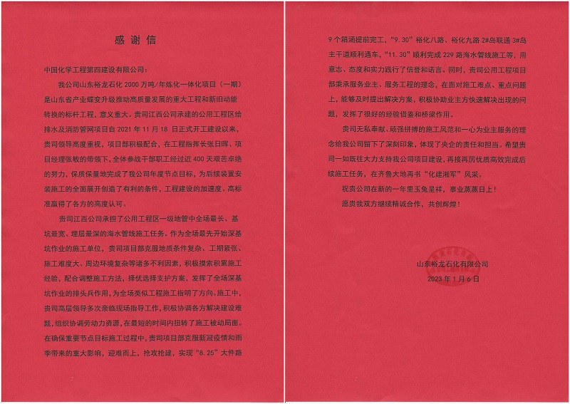 新年伊始,江西公司收到山東裕龍石化有限公司的《感謝信》,感謝江西公司在承建的山東裕龍石化公用工程區(qū)給排水及消防管網(wǎng)項(xiàng)目中,保質(zhì)保量完成了業(yè)主的年度節(jié)點(diǎn)目標(biāo),為后續(xù)裝置安裝施工的全面展開創(chuàng)造了有利的條件,工程建設(shè)的加速度、高標(biāo)準(zhǔn)贏得了各方的高度認(rèn)可,公司無(wú)私奉獻(xiàn)、頑強(qiáng)拼搏的施工風(fēng)范和一心為業(yè)主服務(wù)的理念,體現(xiàn)了央企的責(zé)任和擔(dān)當(dāng)。