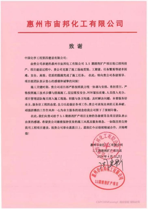 近日,公司收到惠州市宙邦化工有限公司發來的致謝信,信中對公司圓滿完成惠州市宙邦化工有限公司3.5期溶劑擴產項目施工任務表示衷心感謝。