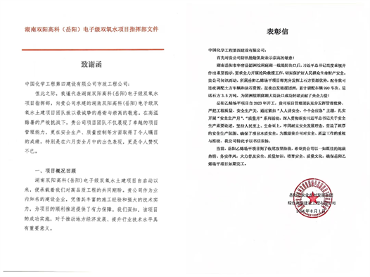 湖南雙陽高科(岳陽)電子級雙氧水項目指揮部在致謝函中表示,在雙氧水項目建設期間,面對高溫酷暑的嚴峻挑戰,市政公司項目團隊展現出卓越的項目管理能力,在安全生產、質量控制、進度管理等方面贏得了相關各方的廣泛認可,為項目順利推進作出了突出貢獻,謹向公司和項目部全體人員表示衷心感謝。