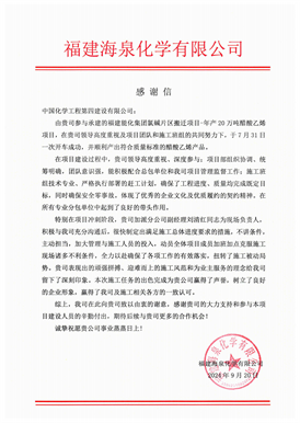 華南公司福建海泉化學醋酸乙烯項目收到業主感謝信