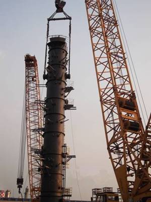 7月22日,江蘇分公司張家港項(xiàng)目部華昌化工原料結(jié)構(gòu)調(diào)整技術(shù)改造二期(凈化)項(xiàng)目現(xiàn)場,經(jīng)過1天緊張有序的檢查確認(rèn),在確保設(shè)備符合吊裝條件后,吊裝總指揮一聲令下,華昌化工二期凈化洗滌塔Ⅰ(第一段256噸)在650噸履帶吊主吊和280噸履帶吊輔吊的吊裝下順利吊裝就位,拉開了該裝置大型設(shè)備吊裝的序幕。