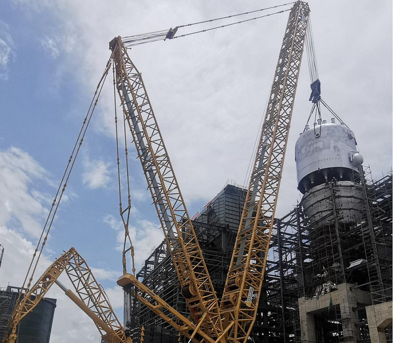 為順利完成該燒炭器的吊裝組對和確保工期,項目部組織人員加班加點,僅一周就做好吊裝前各項施工準備,為順利吊裝奠定了堅實基礎。此次吊裝采用1250噸履帶吊主吊,經過24小時奮戰,成功完成燒炭器的吊裝組對。