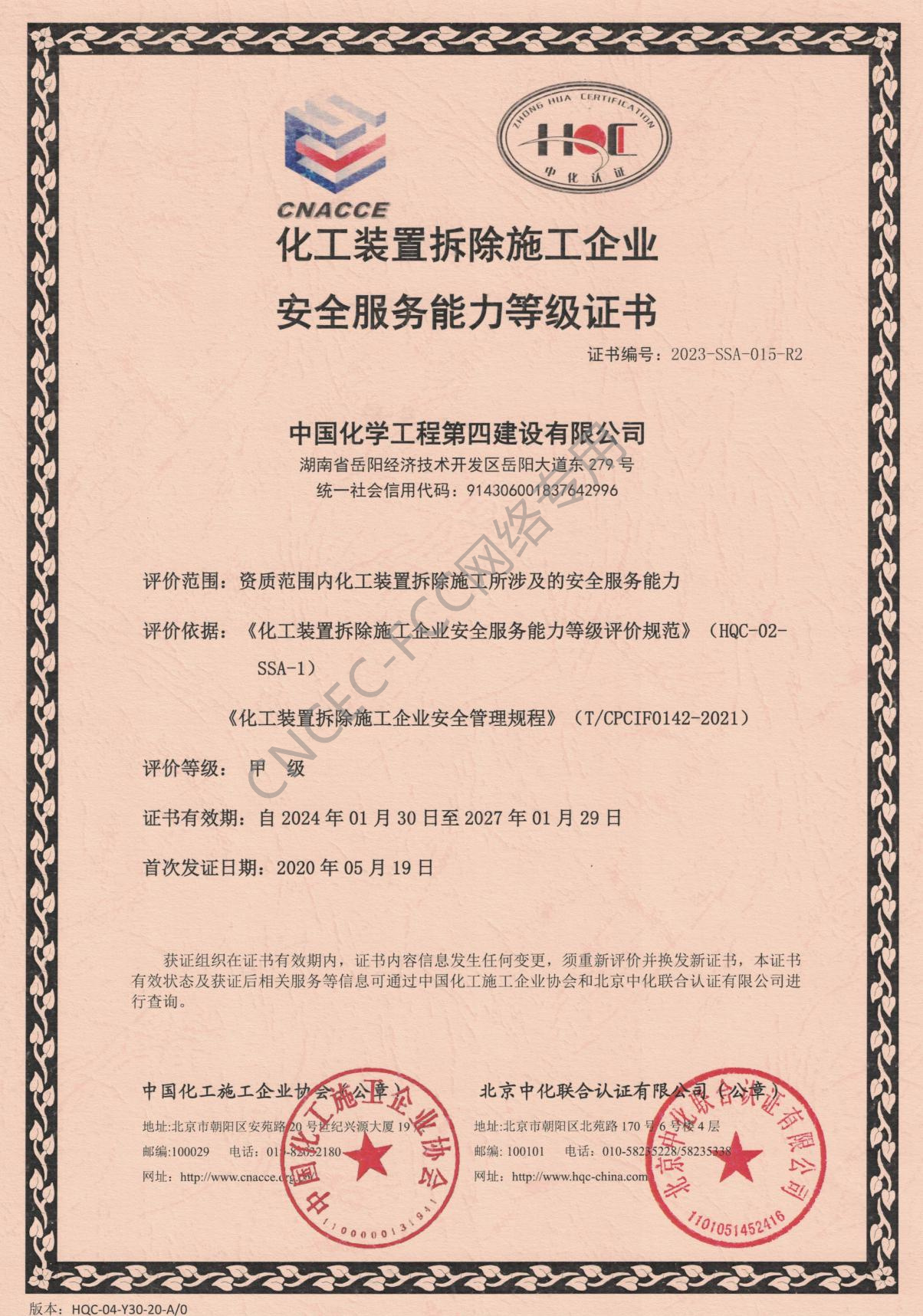 化工裝置拆除施工企業安全服務能力等級證書