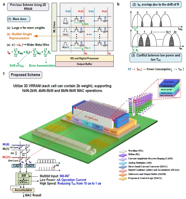 圖1. 2D RRAM應用于大型3D CNN的挑戰及所提出的三維計算方案。a、更多的權重、多位權重表示和更寬的金屬線引入更多設計難題 b、讀出電流的挑戰是交疊及低功耗和低延遲之間的矛盾。c、基于MLSS 3D VRRAM的高精度非易失存內計算方案。借助CADS電路的ADINWM方案可以有效緩解傳統PWIVMM方案引起的電流交疊,提高推理精度。基于集成3D VRRAM芯片的CIM宏的實現闡述了執行CNN邊緣計算的完整解決方案。