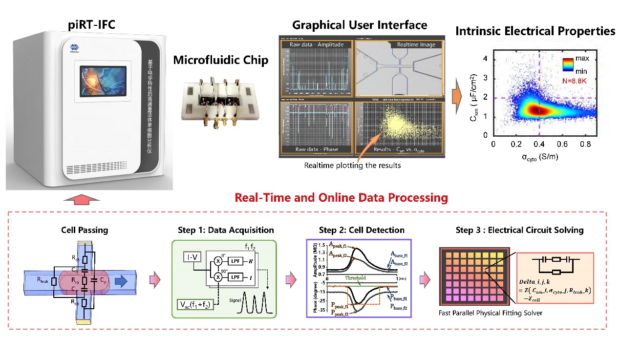 圖1 實時阻抗流式細胞分析儀(piRT-IFC)原理樣機、核心微流控芯片、設備交互界面、典型結果和自動化實時數據處理流程