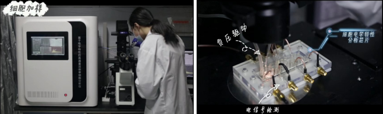 圖2. 基于微流控芯片技術的單細胞電學特性活體單細胞分析儀(左)及核心微流控芯片(右)