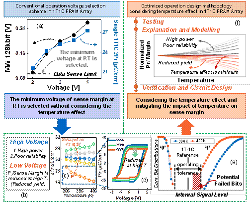 1T1C鐵電陣列中 (a) 傳統操作電壓選擇方案以及 (f) 考慮溫度效應的操作電壓設計方法。(b-e) 傳統操作電壓選擇方案將會導致高溫下的誤讀等問題